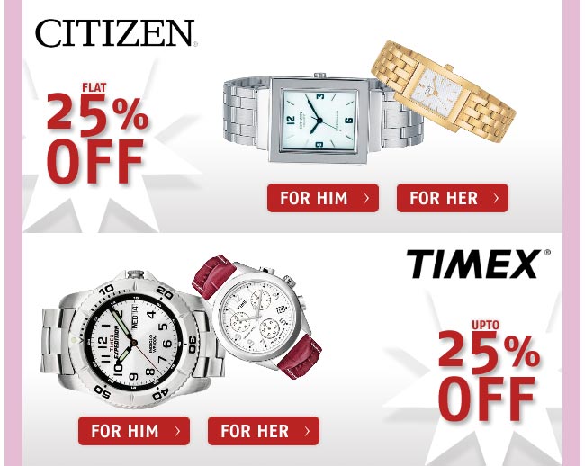 Watches flat 30% offCitizen Men's Watches flat 25% offCitizen Women's Watches flat 25% offTimex Men's Watches upto 25% offTimex Women's Watches upto 25% offTommy  Hilfiger