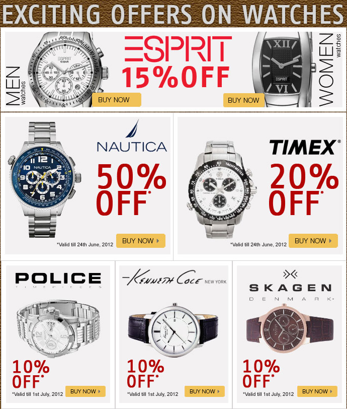 15% off on Esprit Men's Watches - Buy Now15% off on Esprit Women's Watches - Buy NowNautica watches 50% off - Buy NowTimex watches 20% off - Buy NowPolice watches 10% off - Buy NowKenneth Cole watches 10% off - Buy NowSkagen Watches 10% off - Buy NowVan Heusen Buy two & get Rs. 500 OffWills Lifestyle 20% off - Buy NowPark Avenue Buy two & get Rs. 500 OffAcropolis Buy two & get Rs. 500 OffVettorio Fratini 15% off - Buy NowIndian Terrain 20% off - Buy NowSTOP Buy two & get Rs. 500 OffAustin Reed Buy two & get Rs. 500 OffRedTape 20% off - Buy NowFranco Leone 20% off - Buy NowIWalk 20% off - Buy NowVettorio Fratini 20% Off - Buy NowPerfumes - Buy NowBetls - Buy NowWallets - Buy NowPens - Buy NowShare this mailerJoin us on FacebookJoin us on Twitter