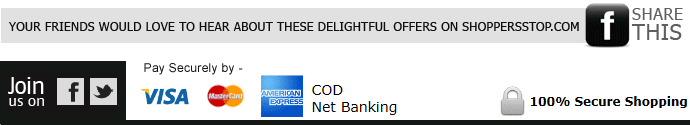 | Please remember that Shoppers Stop does NOT sell, rent, license or otherwise disclose any personal information to other parties. To ensure that future emails from Shoppers Stop aren't filtered to your junkmail folder, add estore@shop.shoppersstop.com to your address book. Click here to change or remove your subscription Shoppers Stop Ltd. - Eureka Towers, 9th Floor, B - Wing, Mind Space, Link Road, Malad (W) Mumbai - 400 064 Copyright 2008 - 2012 Shoppers Stop Ltd. All Rights Reserved. | |